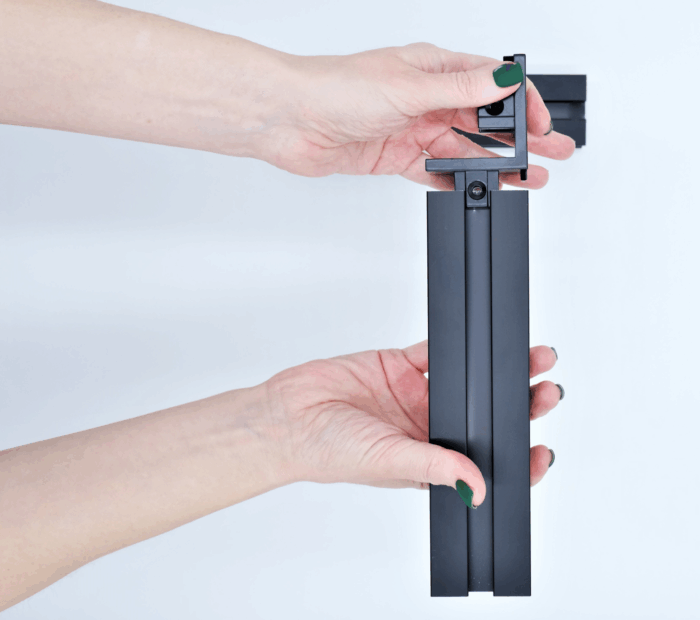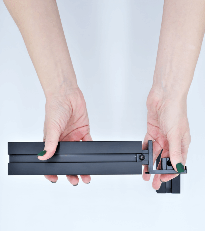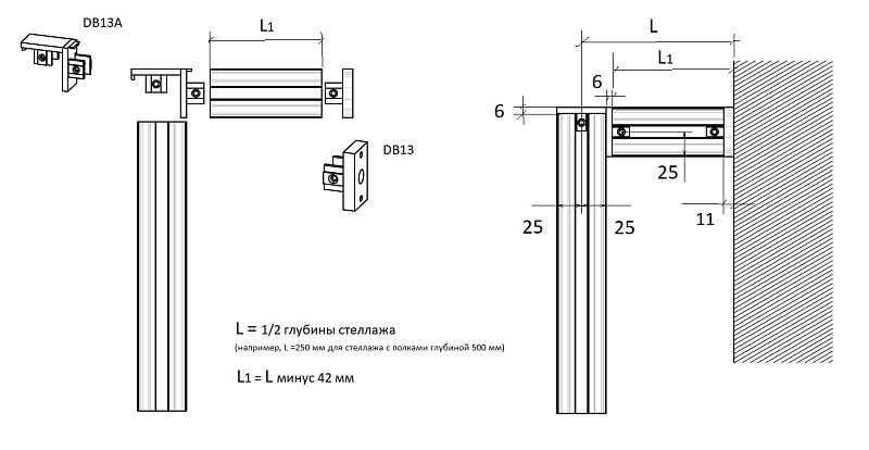 Соединение угловое под 90° под винт. Служит для соединения профилей под прямым углом для “Г”, “П” и “О” -образных конструкций. Стеллаж с таким креплением к стене выглядит современным, красивым и лаконичным. Глубина стеллажа может быть любой. Профиль отрезается под прямым углом. Это соединение на требует запила профиля под углом и дополнительной присадки. Профили-стойки насаживается на угловое крепление с двух сторон и фиксируются винтами М5х8 (винты покупаются отдельно)