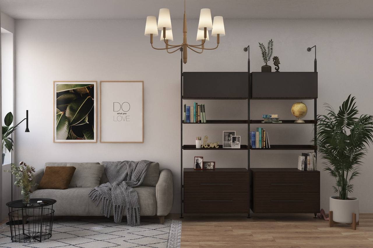 Деревянные/стеклянные полки и навесные мебельные модули в комплект не входят и заказываются отдельно.
